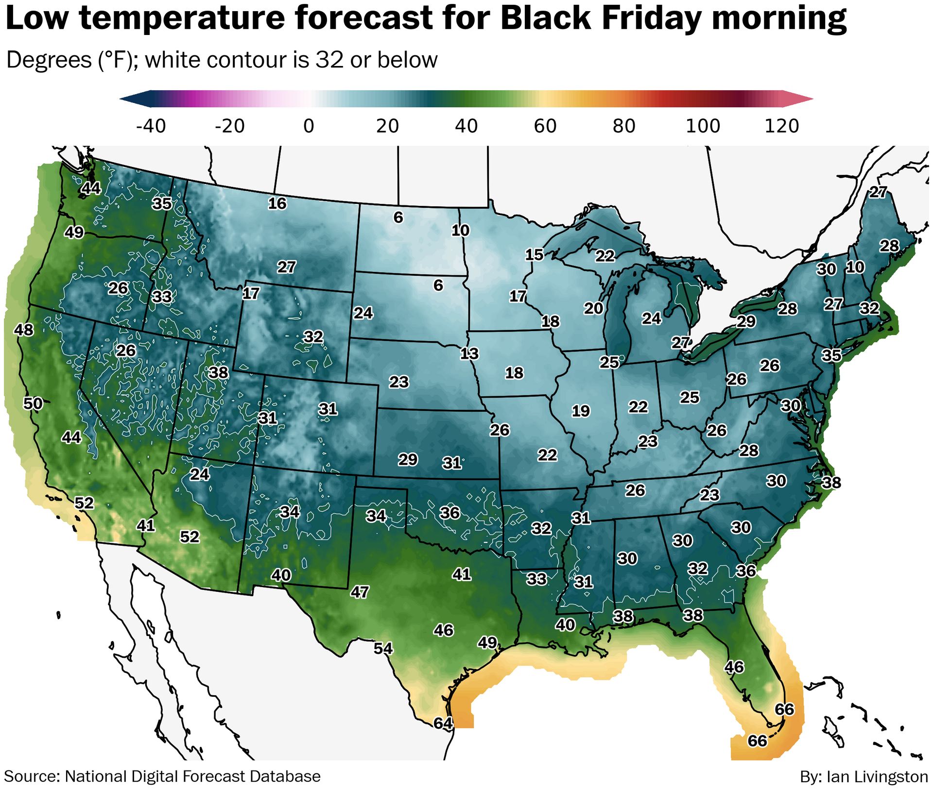 The eastern two-thirds of the Lower 48 are mostly in the deep chill Thanksgiving and Black Friday, with cold either reinforced (central) or lingering (east) through the weekend.