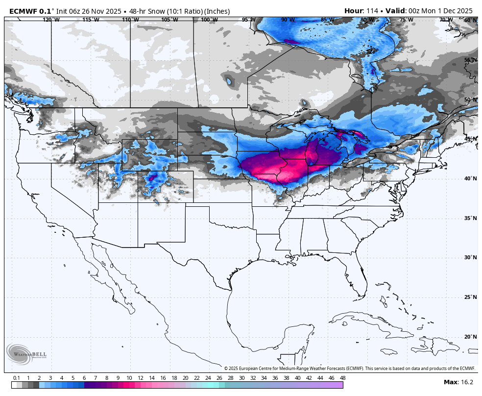 A second storm this weekend could target Chicago. (weatherbell.com)