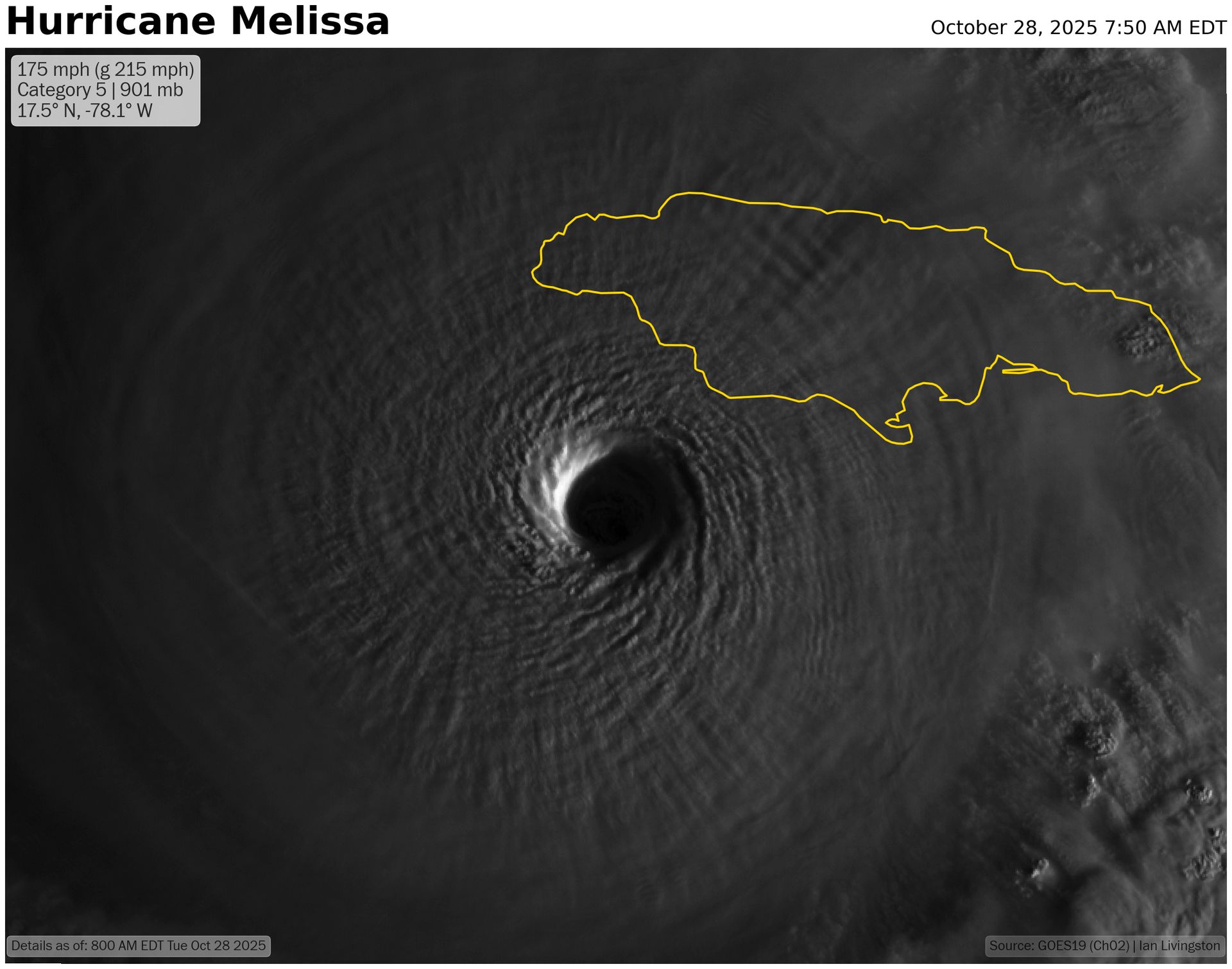Melissa crawled north over the past day, sitting about 35 miles from the coast of Jamaica at sunrise Tuesday. It is beginning to speed up. Landfall — the center of the eye hitting shore — is expected midday. While there are some signs of an eye wall replacement, which can slightly weaken a storm, no weakening is evident yet and it seemingly won’t have enough time to fall below Category 5 ahead of impact.