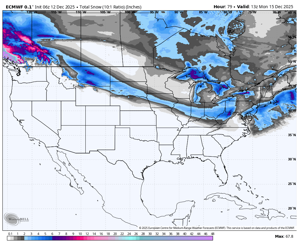 Long-tracked clipper. The latest in a series of fast-moving storms out of western Canada is set to dive southeast across the Lower 48 this weekend on the front end of an Arctic intrusion. Like most clippers, this one will be moisture starved, so snowfall totals won’t be too impressive — a general 2 to 5 inches, with some locations seeing up to half a foot or so. However, it may drop a rather continuous stripe of snow from Alberta Province to the Appalachians, then curving northeast toward Southern New England, a path of nearly 2,500 miles.