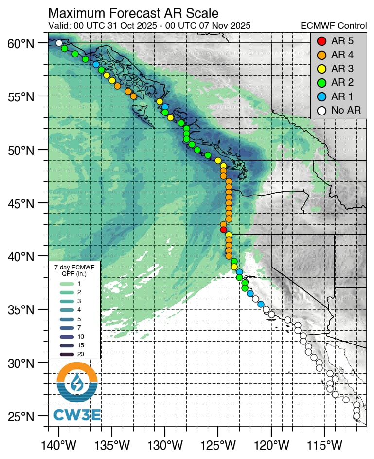 Stormy Pacific Northwest. One of the places seeing unfriendly weather on Halloween is the Seattle to Portland zone. It’s the first of several storms to hit the region over the next week. A level 3 or 4 atmospheric river is associated with the first wave, and next week’s may be even stronger. Up to 1-3 inches of rain is forecast over the next few days with more to come thereafter.