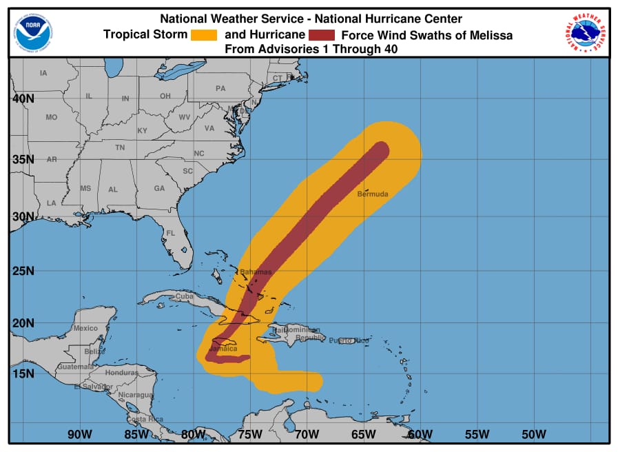Bye, Melissa. Melissa passed Bermuda after causing minimal damage and about 20,000 power outages at peak. The storm is in the process of rapidly losing tropical characteristics. It will swing close to Newfoundland as a powerful extratropical storm featuring heavy rain, strong wind and large waves.