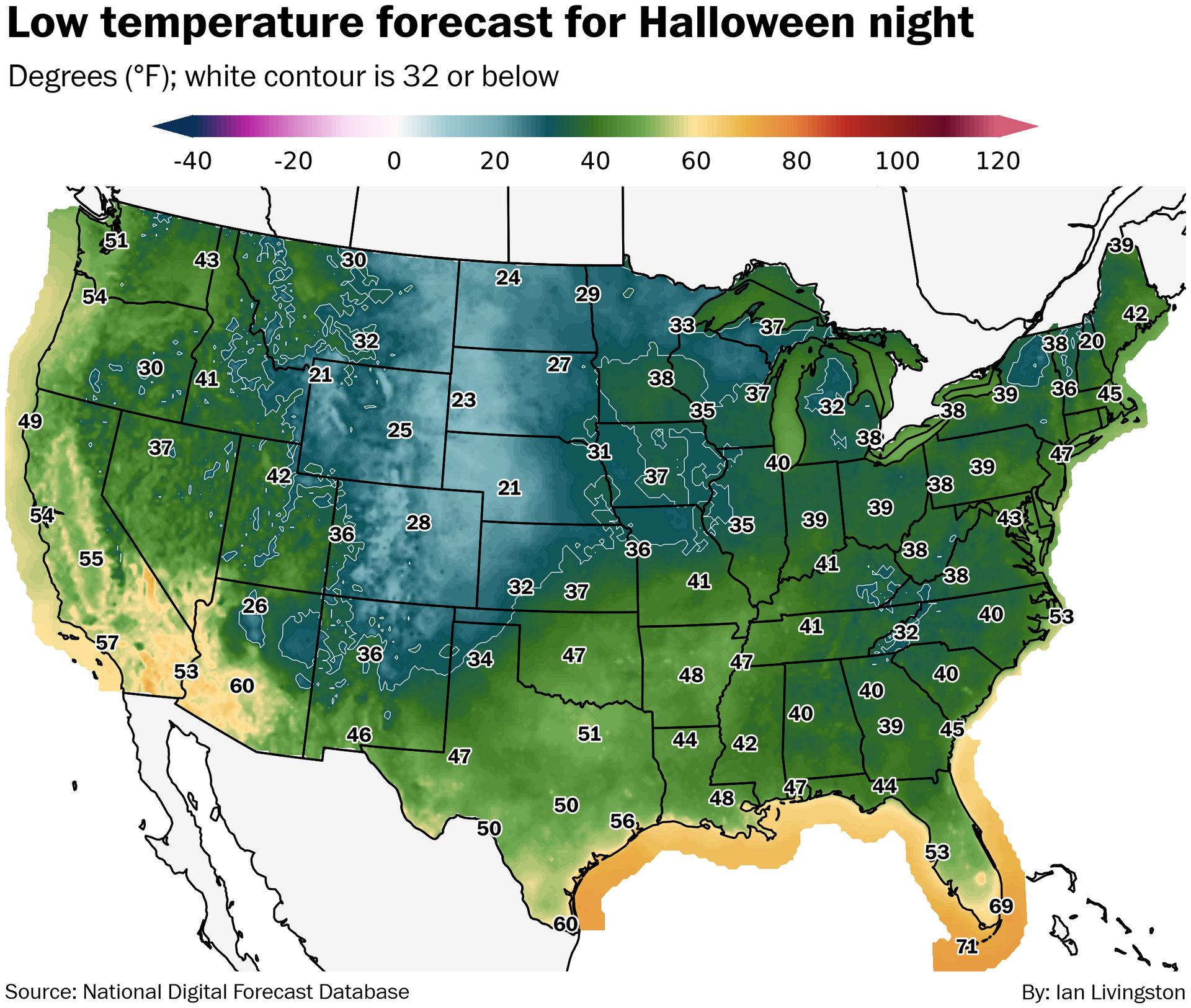Trick-or-treat. It’ll be a chilly Halloween in much of the country, but many places will also see dry weather for trick-or-treating. Wind advisories are in effect for southern New England, New York and into the northern Mid-Atlantic. Gusts as high as 50-plus mph will impact much of that region in the wake of a powerful storm working toward northern New England. With the chilly air in the area, frost advisories were hoisted from northern Alabama to western North Carolina.