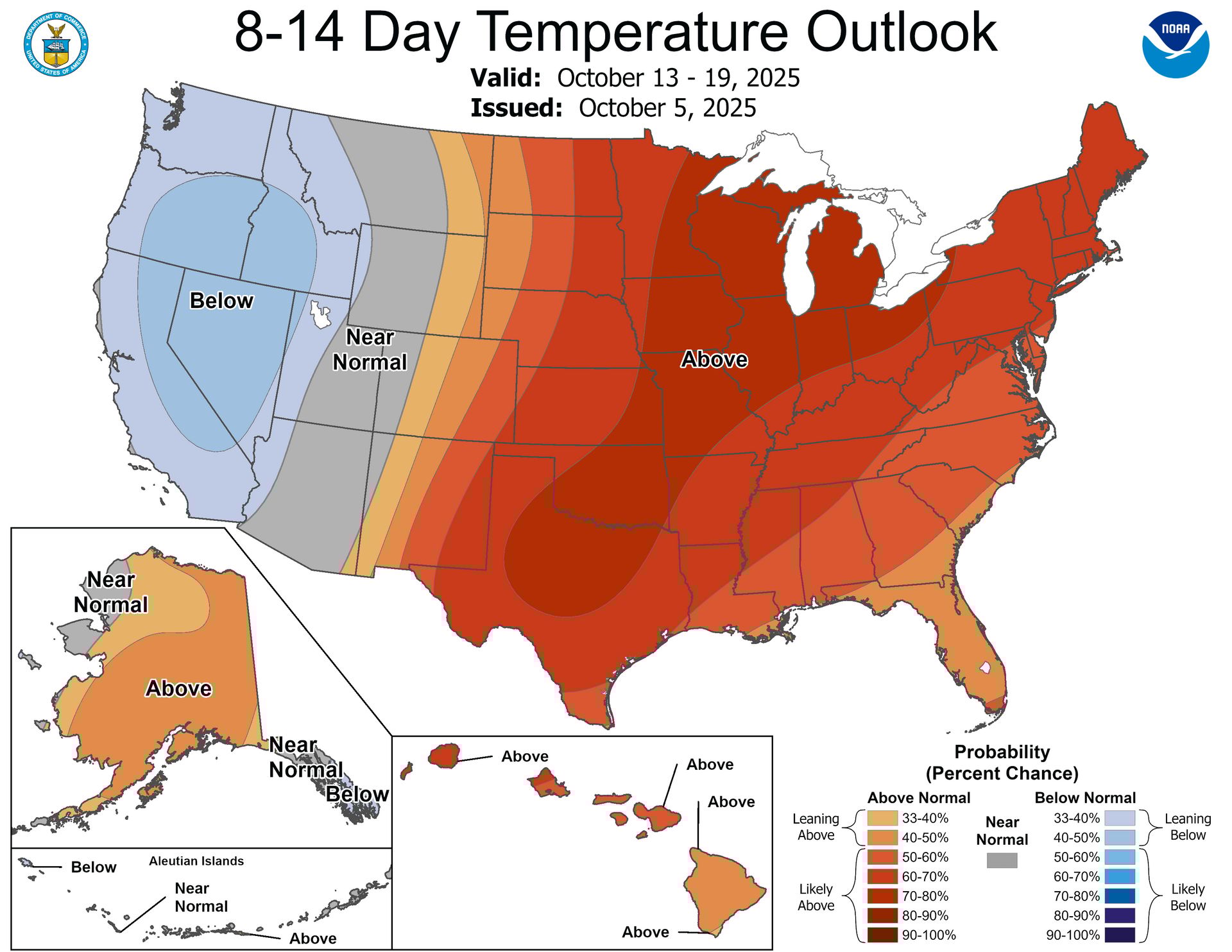 And the longer range also suggests heat will be more prevalent than not for the next two weeks in the central and eastern U.S. Cooler than normal is more likely in the west.